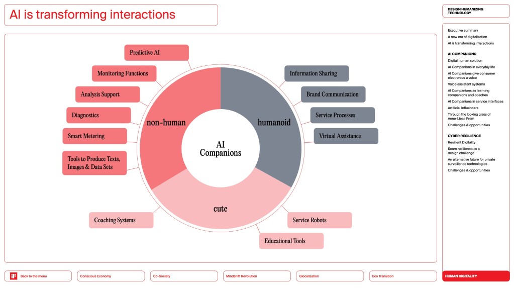 Bridging Human Digitality to Conscious Economy, two sections of the report, Ziyuan Zhu presented “Humanizing AI in Design,” focusing on integrating AI as a collaborator in the design process and exploring AI embedded in physical objects ranging from the Tamagotchi of the 1990s to this year’s hot-new-thing, the Rabbit. Zhu brought to life the importance of tone of voice, mannerisms and unpredictability as elements that can make an AI more relatable. She also points out how the rise of AI technologies is reshaping work environments, making them more efficient and adaptable—a clear example of the The Conscious Economy which focuses on the shift from a performance-oriented society to one that values creativity, health, sustainability and collaboration.