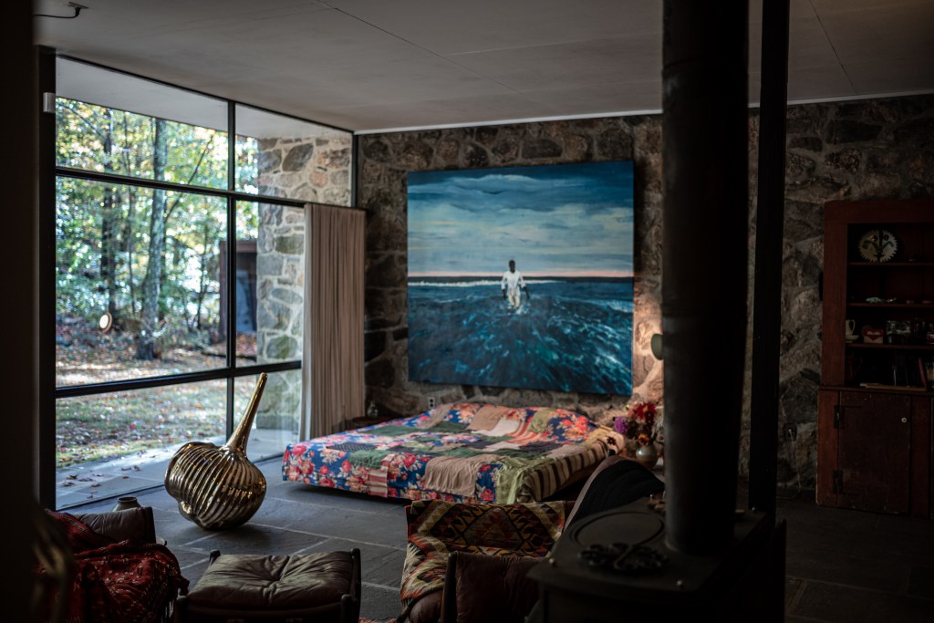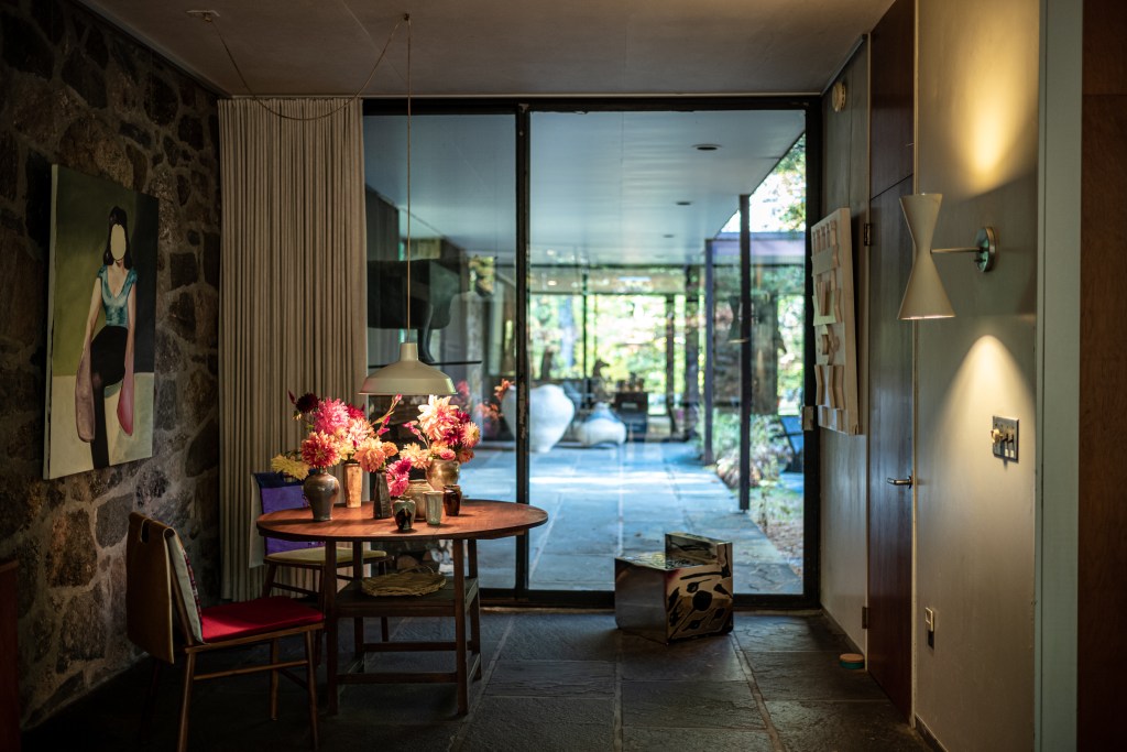 Harvard Five architect and IBM industrial designer Eliot Noyes’ mid-century modernist home currently hosts an enveloping exhibition, At the Noyes House: Blum & Poe, Mendes Wood DM, and Object & Thing, that transports guests out of time and place. In the same Connecticut town that draws architectural tourists to the Philip Johnson Glass House, New Canaan, the Noyes House exhibit sees the work of 34 international artists and designers playing off its unique glass surroundings—and is open to the public for the first time ever. Remarkably, Noyes was the head of the industrial design division of MoMA at the same time Johnson was the head of architecture there—and Johnson (with a handful of their other peers under Walter Gropius) came to the town at the behest of Noyes. Thus, a movement was born.