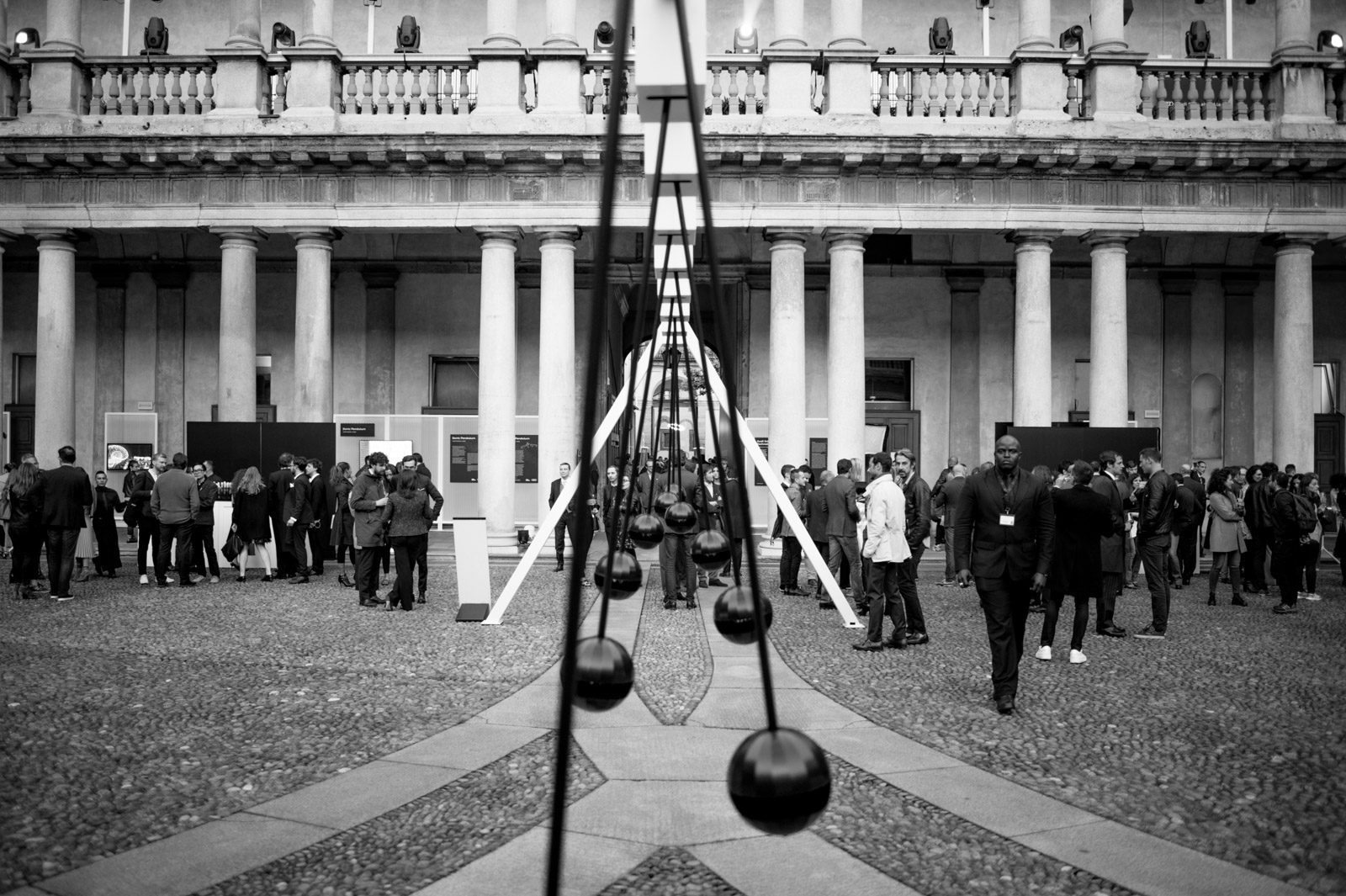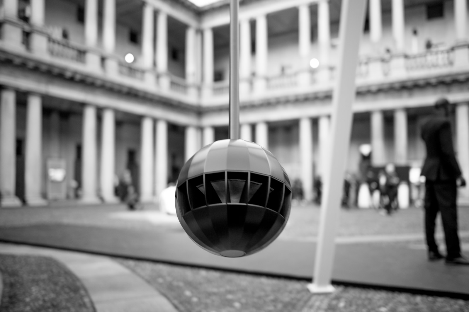 “I was thinking, ‘What if I created an algorithm which is reacting with people inside, simulating natural movement and creating a constantly changing soundtrack in the space?’” he says. The three large pendulums were centered in the seminary’s courtyard, with new Audis displayed nearby. Sonic Pendulum beautifully illustrates the brand’s passion for design, movement and art; the kinetic energy of the sculptures creating a tension with the space and the cars.