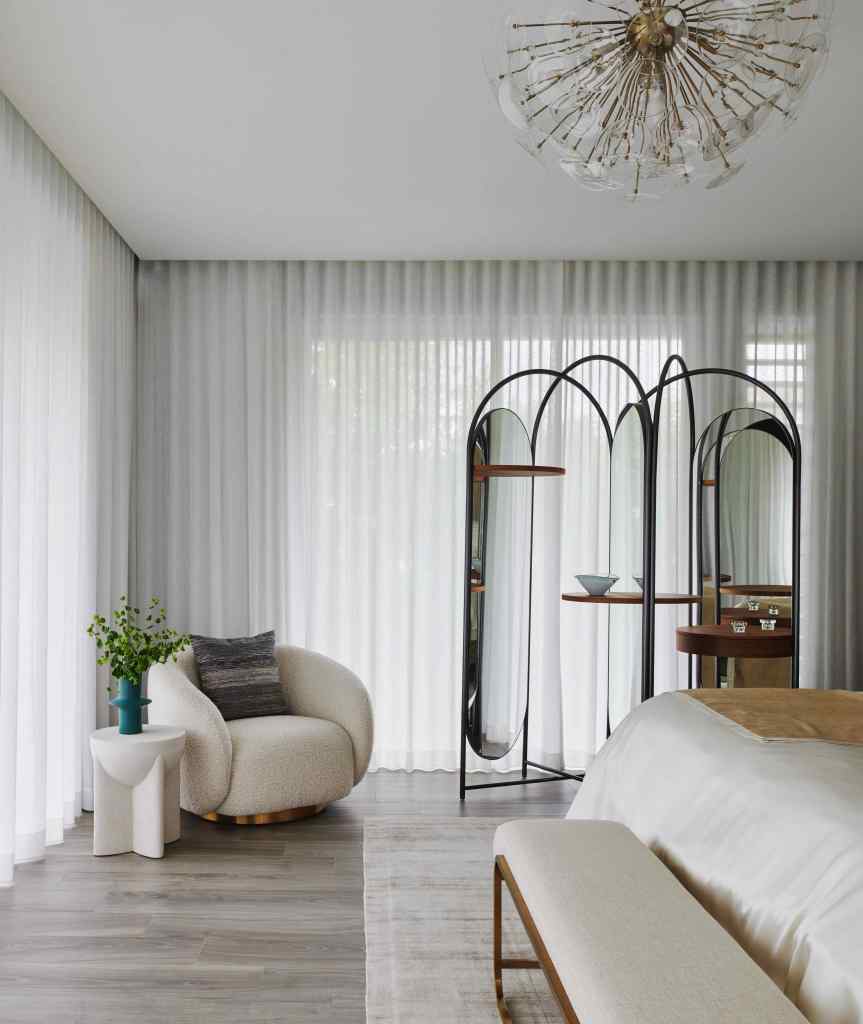 The upstairs primary bedroom was designed as a large suite with a separate seating/TV area behind the bed and a large spa-like primary bathroom. In the bedroom a silk blend wallcovering creates a cocooning backdrop with the coziness enhanced by a silk rug and silk bedding from British brand Gingerlily. The dramatic Fendi mirrored screen creates privacy and functions as a dressing area. The boucle chair sits next to a vintage Spanish vase. Brass accents from the table lamp and bench inject a hint of warmth. Used throughout the house porcelain floors were selected for wearability in the Florida climate. Linen drapes, an Assure signature, integrate blackouts behind.