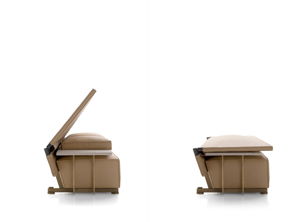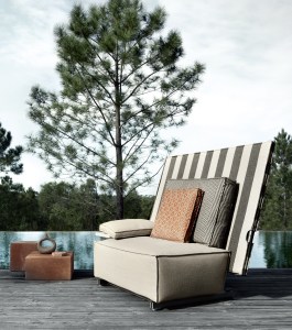 That splendid practicality leads Starck to explain that the collection is about innovation and much more than putting an outdoor fabric on indoor furniture. He tells us, “This collection is not about style, not about trend, but about the rain. After years of work we developed, with the B&B Italia Research and Development Centre, an original mechanical joint made of aluminum which allows the backrest to easily be use as a protective flap when it starts to rain. But also to be quickly ready as soon as the sun comes back.”