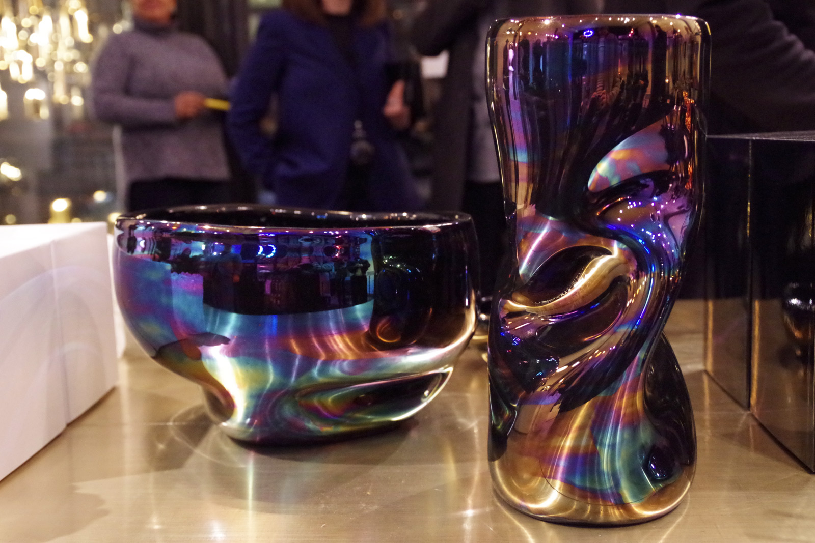 I’ve been interested in metallic finishes for a long time. We’ve done quite a job in promoting copper and the copper industry. [laughs] But, I’ve been interested in metallic colors generally. Here, we hit on this iridescence that we’ve been looking into for quite a while, but struggling to get anything that’s convincing from using paints or color changing materials. Now we have a convincing glass finish, which we are showing for the first time in the world, right here in New York. Although, it’s not a big launch, it’s a preview of Maison & Objet—one of our two biggest showcases, with the other being Milan.