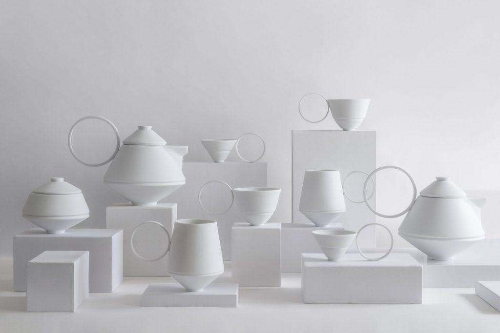 Ultimately, an eye-catching all-white color defines the objects. “There is still a sense of calm, zen harmony, which is found in absolute white,” explains Facchinetti. While the color isn’t typical of East Asia, Facchinetti found inspiration in the craft traditions from the region. The designer embarked on hours and hours of research before beginning the project. “When it comes time to start drawing, the synthesis of everything I have absorbed comes out,” she explains. “In this case, I started with pure shapes and simply assembled them. Then I looked for the right inclinations and proportions because I like things that are out of the ordinary. As soon as something becomes too obvious, I always have to find an element of disturbance and imbalance.”