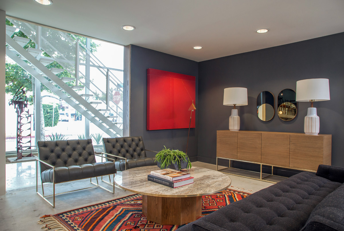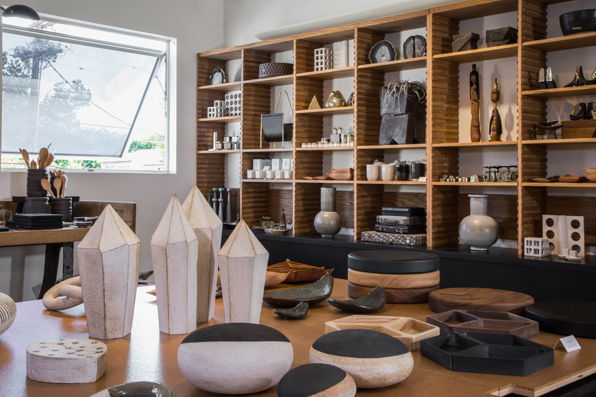 They fill the space with their own designs, vintage finds, and a marketplace of handmade ceramics, metal, textiles, and wood. “This is high ’60s international style building. That is a strong influence in all of our work. Everything we do is very inspired by that period of time. It fits right in with our aesthetic,” says Lawson.