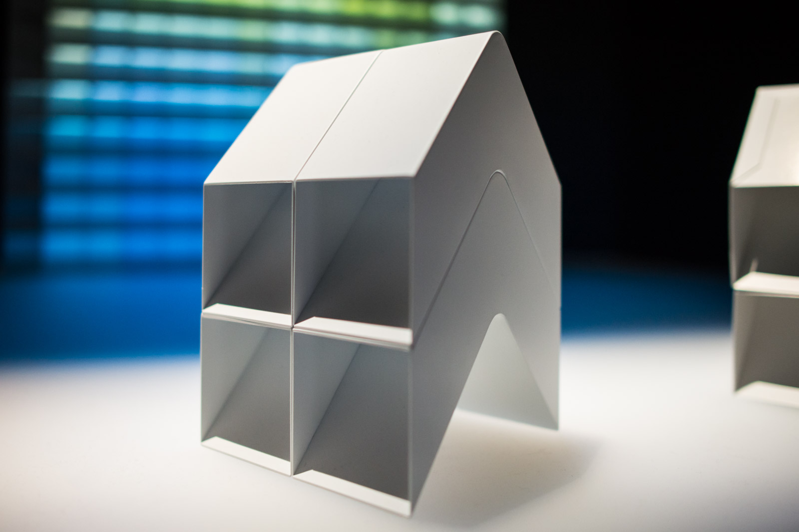 As a child, Tokyo-based Hiroto Yoshizoe loved watching light from the television dance on the ceiling, he told us when asked about his inspiration to work with light in his designs. Pixel is a simple, brilliant expression of this childhood wonder. An a-framed building block that can be rendered in a range of materials and sizes, Pixel bends the light source from one side to create a diffuse rendering on the other—light, yet shadow. Assembled into a screen, a grid of Pixels can bring gentle animation of outdoor light into a room or be used with rear projection to create ambient and artistic animations.
