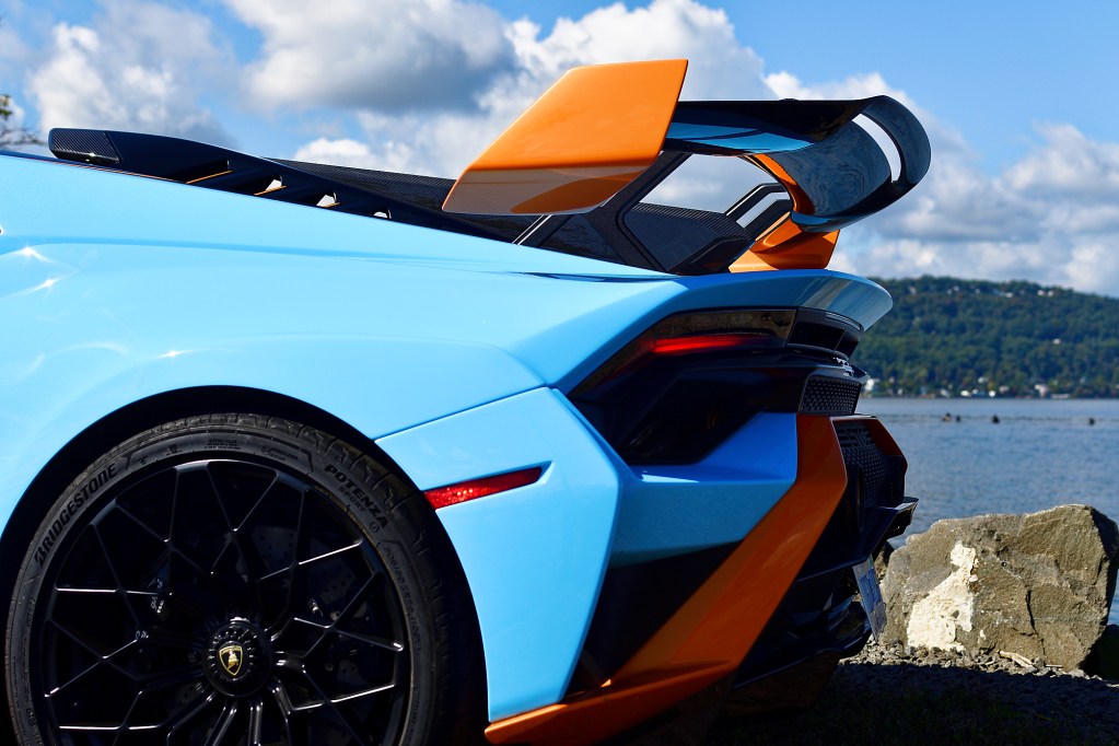 At the back, there’s a snorkel to allow the naturally aspirated V-10 to breath, while a series of deflectors exhaust that hot air. Even as that snorkel cascades into those fins, another oceanic theme rises: a massive carbon fiber shark fin functions as a mast. Just like on a sail boat, the fin directs air from the side, giving the STO a force to lean against through corners while air funnels down into the massive rear wing. This last, and hardly least visually overt element can be tacked to different angles, either for more grip or more aerodynamic efficiency.