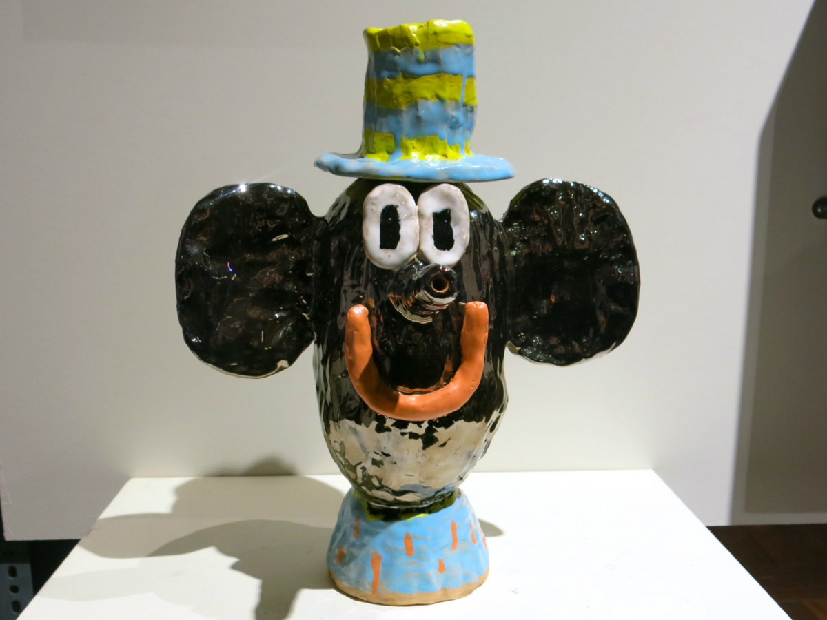 At the recent Beer at Beach exhibition in London, Charlotte Mei’s wizard-pup stood out among the other, two-dimensional pieces. At Pick Me Up, her child-like ceramic sculptures fit right in. Inspired by the internet, video games and manga, Mei populates her kawaii world with humorous sculptures like the “Reclining Worm” and the “Monkey Pot.” She also showcased her first-ever jewelry designs: brass medallions that included dog and heart references. They can be bought with their own ceramic frames, making them wearable art.