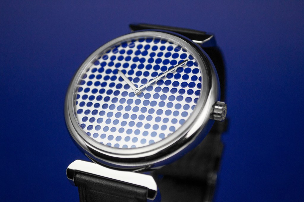 One unique piece (commissioned by a private collector) would initiate Meerson’s pursuit of this limited edition line. Meerson is often asked to design bespoke pieces, and one buyer sought out a companion wristwatch for his Roy Lichtenstein painting, known as “Cirl in the Mirror” (1964). After months of development, and a process that involved hand-painting dots on a mirror-surface dial, the watch (above) was completed.