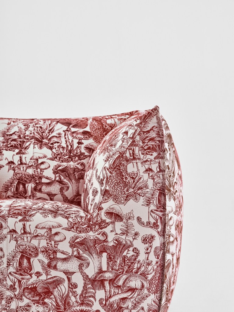 Covered in a peculiar pattern of hand-drawn mushrooms (named “Fungi Forest”), B&B Italia‘s collaboration with Stella McCartney honors the 50th anniversary of the brand’s iconic Le Bambole armchair, designed in 1972 by Mario Bellini. It’s the Italian furniture manufacturer’s first fashion collaboration and a most comfortable creation to settle into.