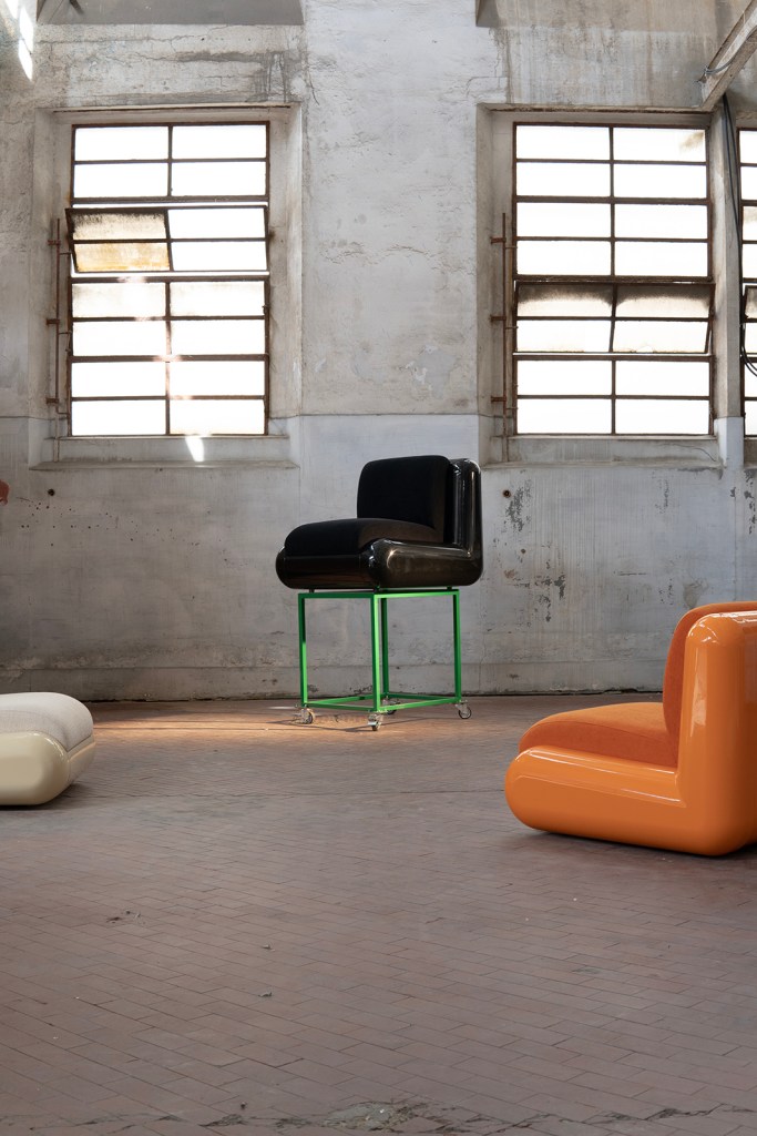 The specific texture of what Holloway refers to as the chair’s chassis is due to Uma’s automotive background. “We’ve done a lot of work with Uma,” Holloway says. “They are, traditionally, the manufacturers of automotive pieces. Their parent company does interiors for London buses. We are using the technology of automotive design but in a way that brings our furniture pieces to life.” The retro-futuristic furniture piece conversed with the decay of the former Porta Vittoria abattoir that housed Alcova this year—and from this contrast came an optimism that will easily contribute to any home or office.