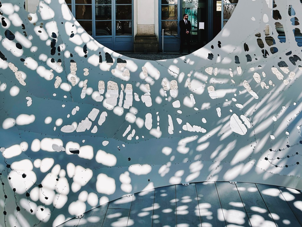 In Palazzo Serbelloni, a shimmering sculpture greets guests before an exhibition of the heritage brand’s Objets Nomades