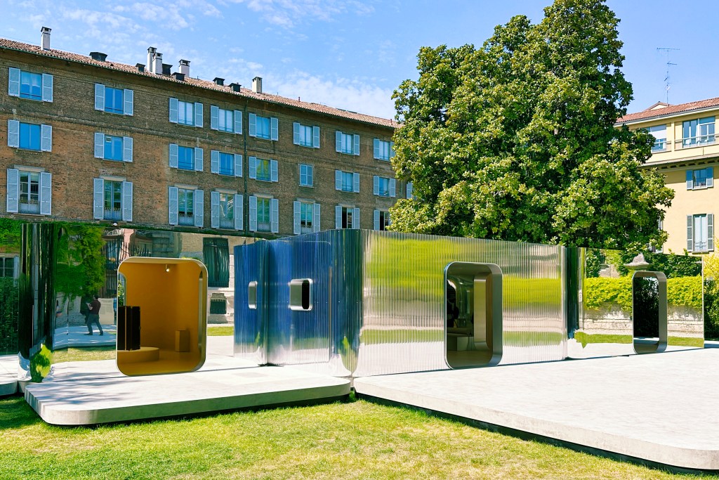 One of the most alluring attributes of Milan Design Week is the city of Milan itself—a place where a stone planter on a street corner or a petite door into a private courtyard quietly attract attention. As such, brands often tap into the city’s splendors and invite guests to step into the extraordinary. Epitomizing this pairing of design and destination, “Pavilion Nomad” is being presented by Louis Vuitton in the heart of the historic Palazzo Serbelloni as an accompaniment to the release of the prestigious brand’s new Objets Nomades pieces. Designed by the New York-based French architect Marc Fornes, also known as THEVERYMANY, the shimmering, organic structure is composed of more than 1,600 ultra-thin strips of anodized aluminum (with no two pieces exactly the same). The bulbous, metallic and coral-like creation even welcomes visitors to explore within.