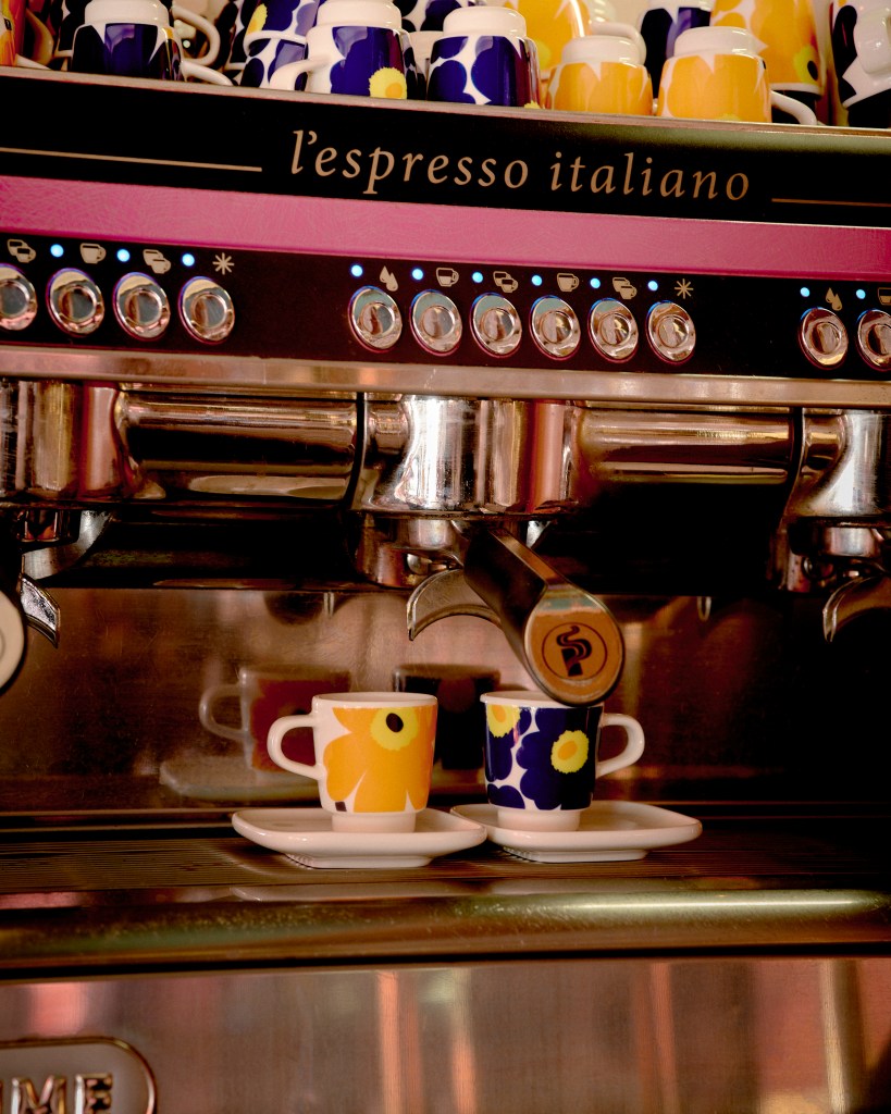 The Marimekko touch is evident everywhere—from the exterior awning to the interior floors, all of the tableware and even the clothing on the cafe staff—but select products have made their debut in Bar Unikko. This includes limited-edition espresso cups as well as mix and match coffee mugs. “Unikko is our most recognizable pattern,” Bay says. “Because of this, we have created anniversary-year exclusives. We rarely talk about original colorways—because what is the original color of Unikko? But here we have gone back into our archive and reenergized some of our colors from the 1960s.” These hues are exactly what one would expect from the lifestyle design brand: sunset orange, cobalt blue and classic red. Each is as joyful as the next.