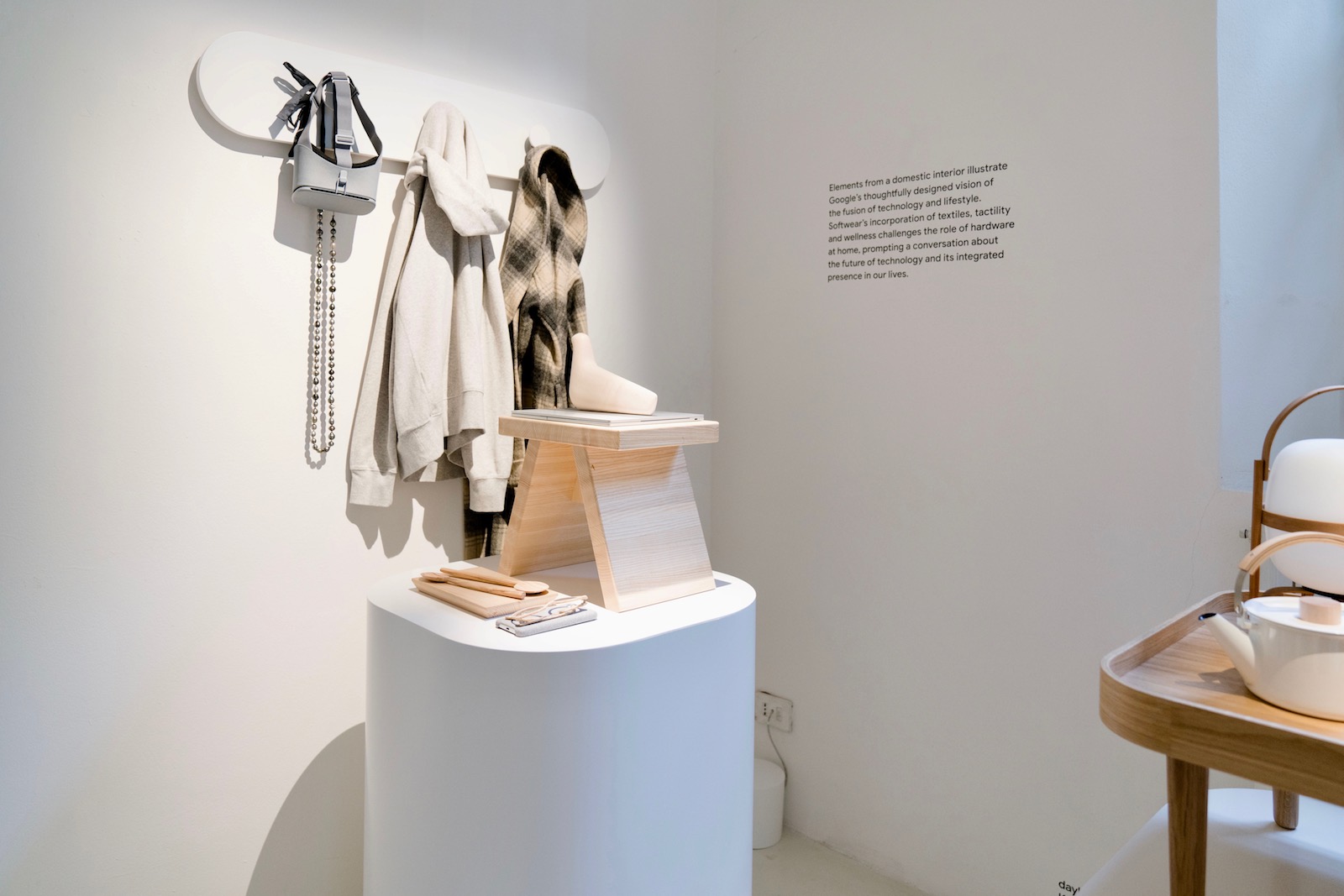 The last room sets Google’s Home and mobile products among furniture, clothes and objects. While all the devices blend in appropriately and carry a somewhat timeless aesthetic, the Daydream VR headset represents such a specific moment in time, it already feels like a relic from the retro-future as it casually hangs on the coat-rack with a hoodie and flannel coat. And thus, the installation offers a conversation starter to further unpack the relationship between today’s technology and our future humanity.