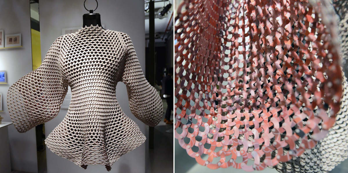 Another finalist, Toronto-born Angelene Laura Fenuta (who studied Material Futures at London’s Central Saint Martins) contributed her Shape Shifters work for the Design Award. Her work questions the current landscape of the fashion industry, aiming to discover new ways of sustainability. She tells us, “I really wanted to work from the textile up. Instead of just using what I was given as a material, I wanted to make my own…and see how I could create something new in fashion.” Of the actual material, Fenuta (who was mentored by Elena Manferdini) explains to us, “I developed a double-faced polyester composite; it has a plastic core which allows it to move, and each articulation is a hinge-point. So you can get various silhouettes out of a sleeve, a skirt, a dress—and you can express yourself however you want, so the wearer is an active participant in the design, which I found really interesting.” Angelene is also interested in reducing consumption and wanted to explore the ways a single dress could serve multiple needs. “What would we want out of it? How many variations could we get out of it?” she asks. We think she’s on to something.