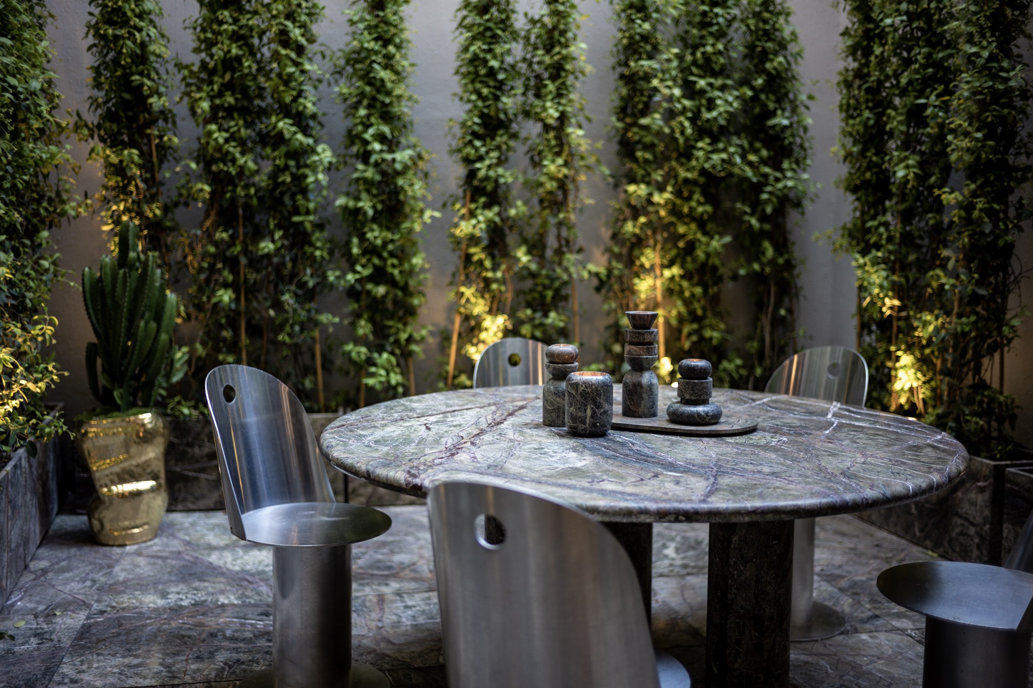 Dixon says that, in some ways, the boredom of the temporary repetition motivated this development. There was also a revelation that food and design work well as business partners. Regarding the former, the restaurant launches with executive chef Roy Smith Paredes Ynfantes and guest chef Marta Pulini. The menu consists of Italian fare. As for its design, a Testi granite slab forms an elegant bar upon entry and Dixon’s products form a unified language inside and out—at a singular marble table in their petite courtyard.
