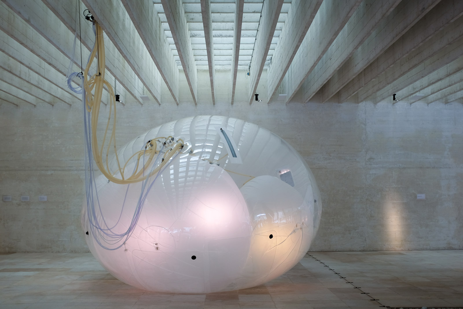 The Nordic Countries Pavilion is populated with gigantic semi-transparent cell-like balloons. These are meant to explore the relationship between natural and constructed environments. With “Another Generosity” curators Eero Lundén and Juulia Kauste investigate the effects of the Anthropocene—the epoch we’re living—in which humankind is able to determine the future of climate change. The balloons of “Another Generosity” slowly change shape and color according to the levels of carbon-dioxide, temperature and humidity in the room, showing—in a tangible manner—how we can impact nature.