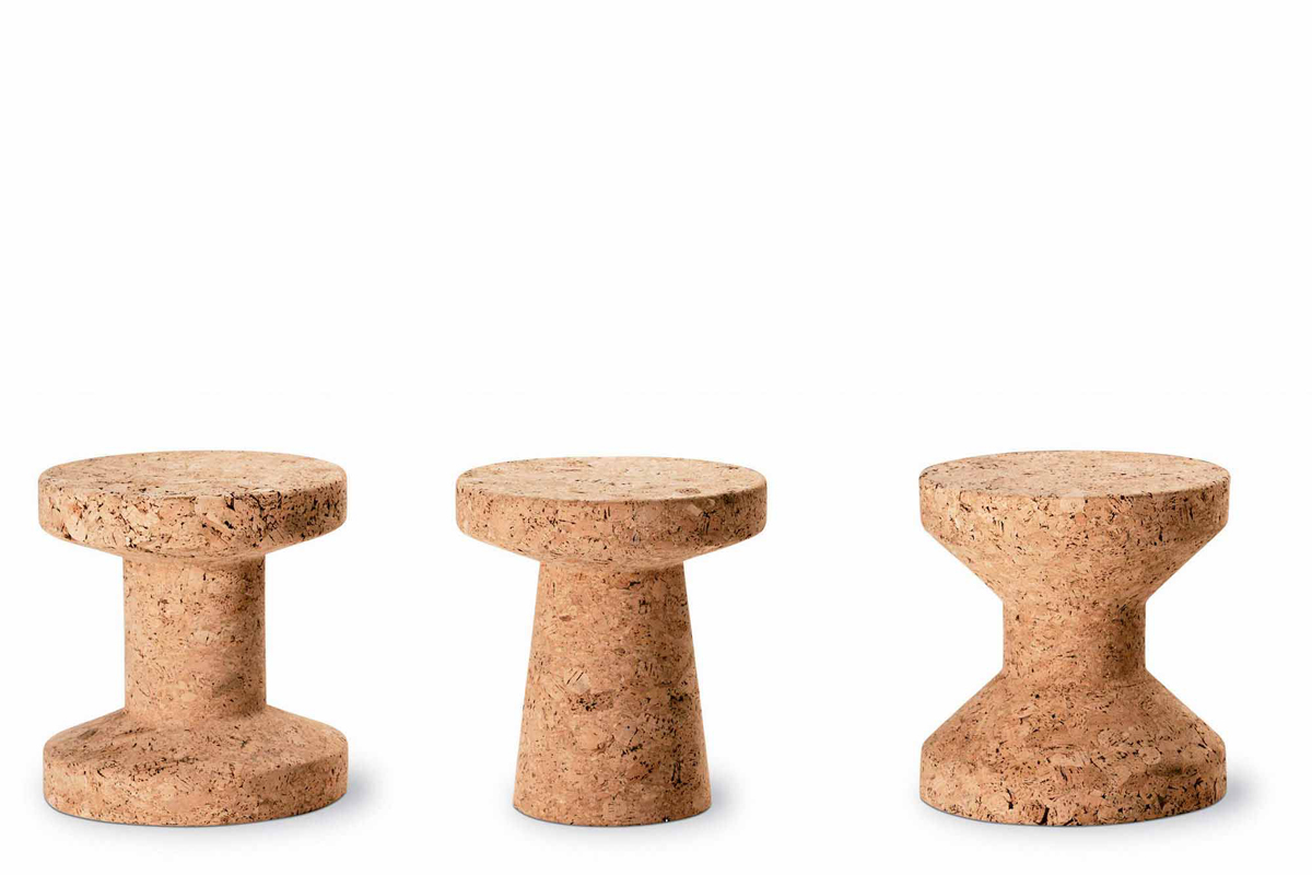 Frequently employing wood, British designer Jasper Morrison‘s use of cork is perhaps more intriguing—and popular. His 2004 “Cork Family,” a set of small tables produced by Vitra, appear to be high-end meditations on champagne corks—a noted design cliché—that is reduced to the bare minimum. Morrison most recently used cork as a façade for a hut produced by Muji and, as he said in 2016, cork is a material that he enjoys (amongst others): he employs it from his “large palette of materials,” used when most appropriate, and it works well as a handle, chair or surface material.