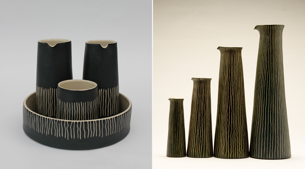 BLH Ceramics, the design studio run by Lynne Hutchinson, is a part of the Design Event MART exhibition held during NDF. It’s a curated selection of the best in contemporary design in the North. Hutchinson’s decorative, minimalist patterned vases are created by combining unglazed surfaces with glazed Sgraffito decoration. Though they’re handmade, the vases all look very much alike, giving them a pleasing symmetrical feel. “I make them from slab pieces of clay and cut them into uniform sizes, so they’re all the same shape and size,” Hutchinson says.