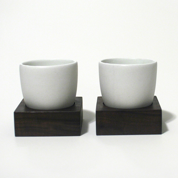 Aside from its deeply thoughtful construction, the set is beautiful. Korean porcelain experts and Italian master wood artisans crafted by hand each hand-cast-porcelain vessel and oil-polished walnut base for an elegantly minimal presentation. The complex subtlety of gregorysung’s design is based on what the press release describes as the “traditional Korean approach to objects and activities: appreciation for the natural state of things while gently creating formality within.” The tiniest flourish comes in the cup’s rounded bottom, which requires the proper placement on its stately little base to stand upright. And, while the outside of the matte-finish cups remains unglazed, up close one will discover a shimmering pearl glaze on the inside.
