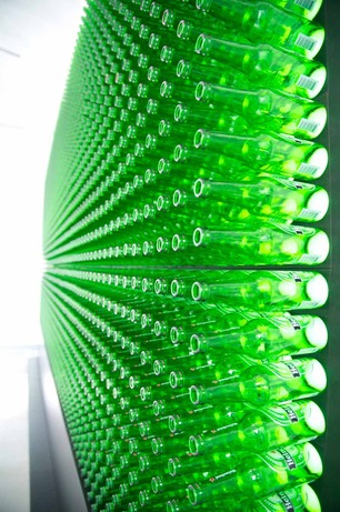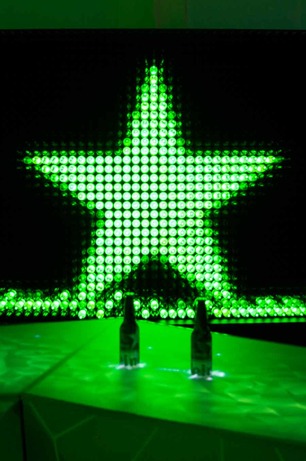 Walking through the completed concept, we found innovative details throughout. A video-mapped DJ booth pumps out killer beats as waitresses in extravagant origami uniforms and custom-designed shoes serve Heinekens from an origami-shaped tray that rests comfortably on the arm and holds up to eight bottles securely so that servers can use their free hand to open the bottles with a matching opener. An interactive bar features video display counters that lets you order another round with the tap of a finger, and a massive display made from more than 2,500 Heineken bottles features programmed images interspersed with live feeds from the dance floor. A wall on the dance floor has numbered shelves to place your drink while you dance, and a black origami wall glows with graffiti from the attached chalk pens, allowing club goers to get graphic in a harmless way.