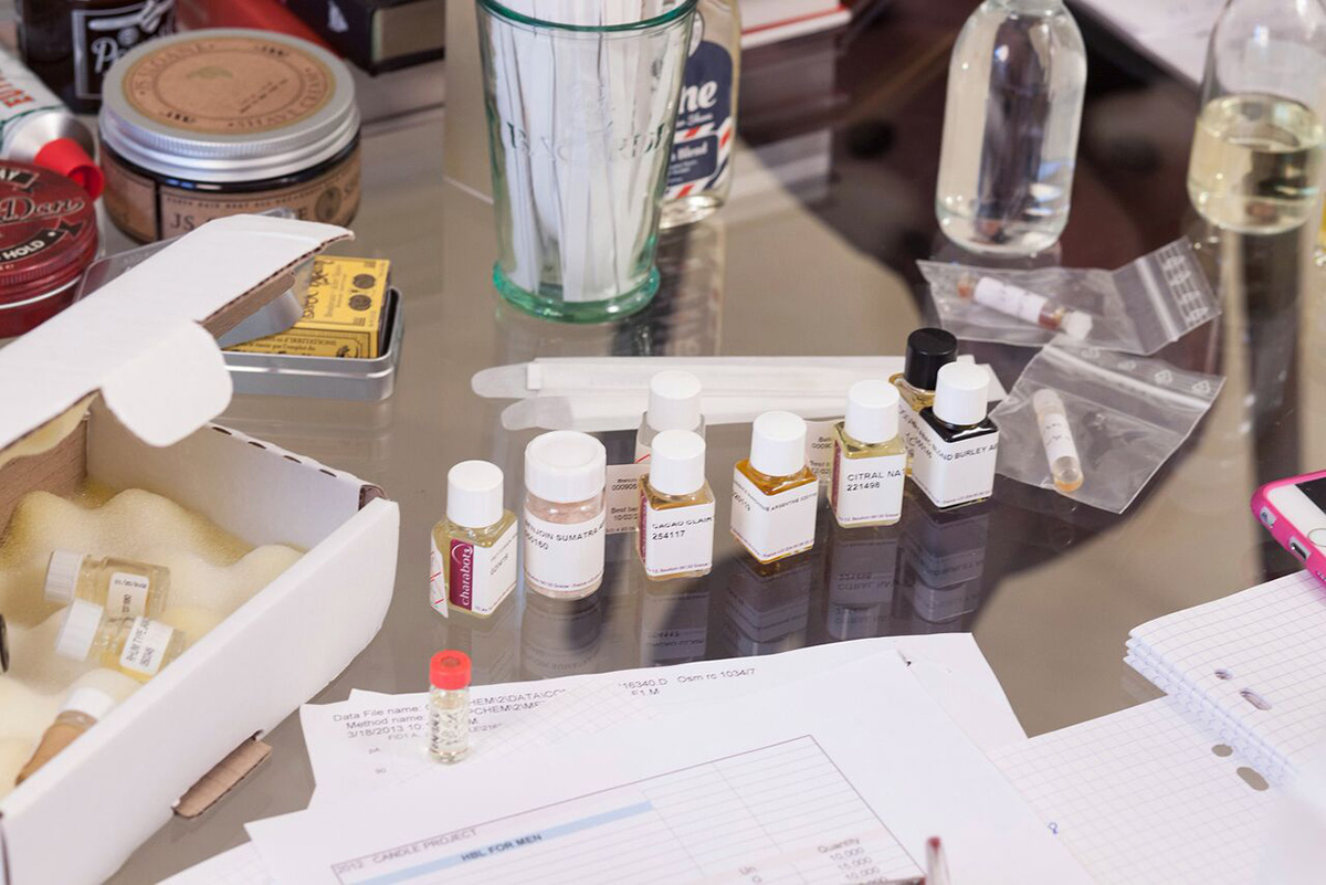 Her nose travels around the world in a heartbeat––the colorful vials in front of her contain vetiver from Haiti, tuberose from India and sandalwood from Australia. Nearby, there’s a copy of The Little Prince, Bruce Springsteen discs and posters from the Coen brothers’ classic, The Big Lebowski. All are sources of inspiration.