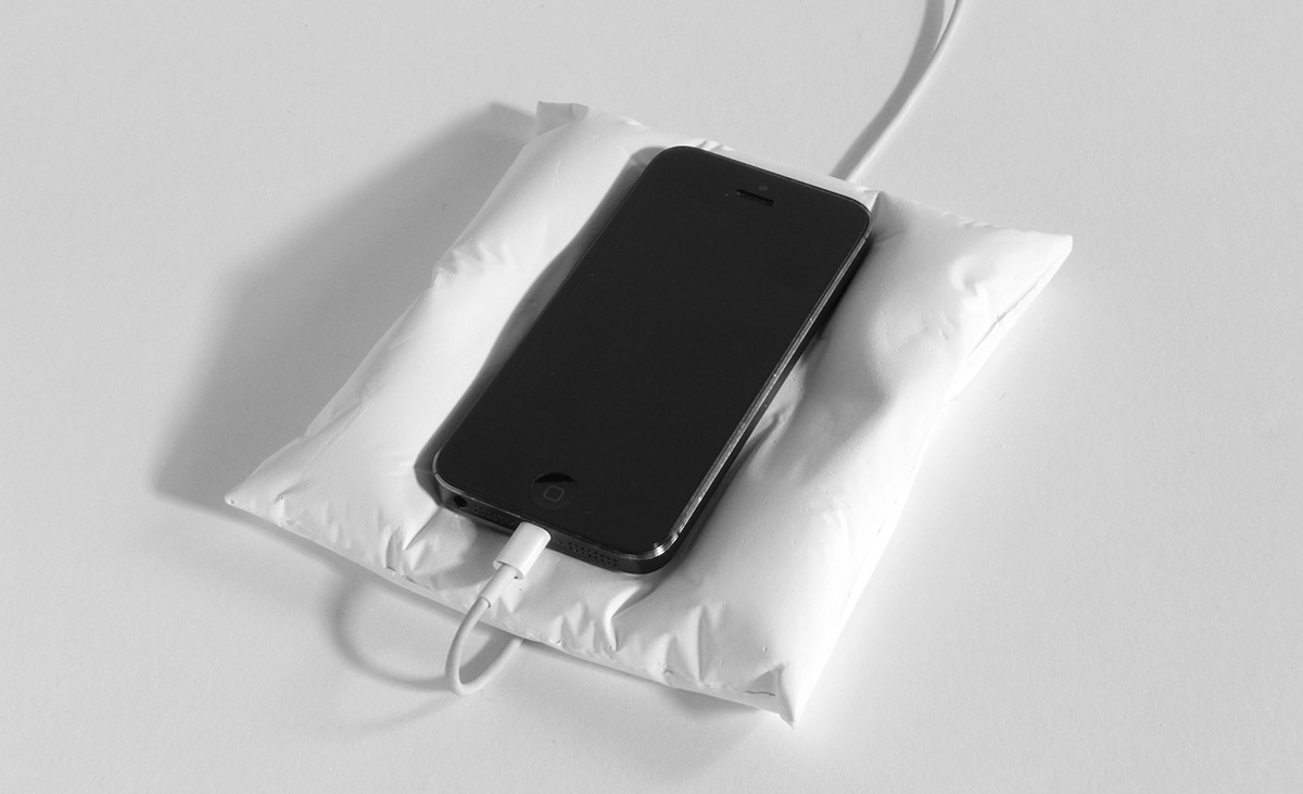 When I come home, I empty my pockets onto the kitchen counter. The initial idea was to have a dedicated place for these everyday objects to rest when not in use, whether on your counter, desk or nightstand. Pillow functions in this way, but is also an interesting object even when the phone is not on it. The memory or trace of the phone imbedded in its surface implies the function of the object. There’s also something helpful about having a single memorable place where these essential items live in your home or office—you know that they’re either there or in your pocket or bag.