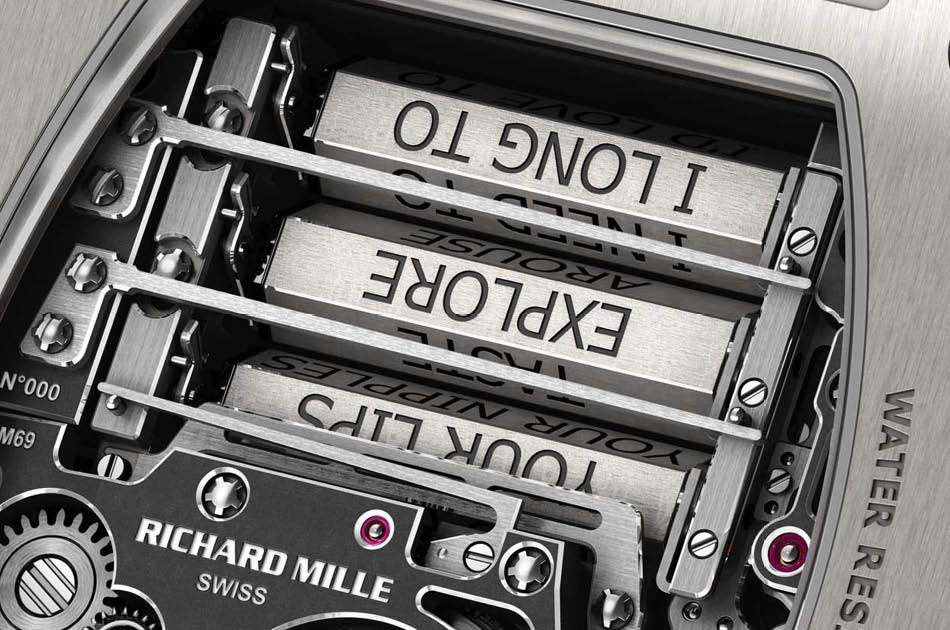 There’s something innately personal about a wristwatch. It rests on the body as a reflection of one’s aesthetic values and design interests. It’s more than an item of utility, it’s one of the rare accessories men wear with frequency. Channeling this notion, luxury Swiss watchmaker Richard Mille announced a new limited edition timepiece, the RM 69 Erotic Tourbillon. The very face of the watch contains open proclamations of sexual desire, dubbed the “Oracle” complication. An interior mechanism, activated by pressing a button near the 10 o’clock indicator, powers three grade-five titanium engraved rollers which shift to another phrase. For clear visibility, the hands can disappear, thanks to another pusher. This isn’t the first time eroticism has been incorporated into fine watchmaking—in fact, it’s an important part of horological history—but it’s distinct in its use of text rather than image.