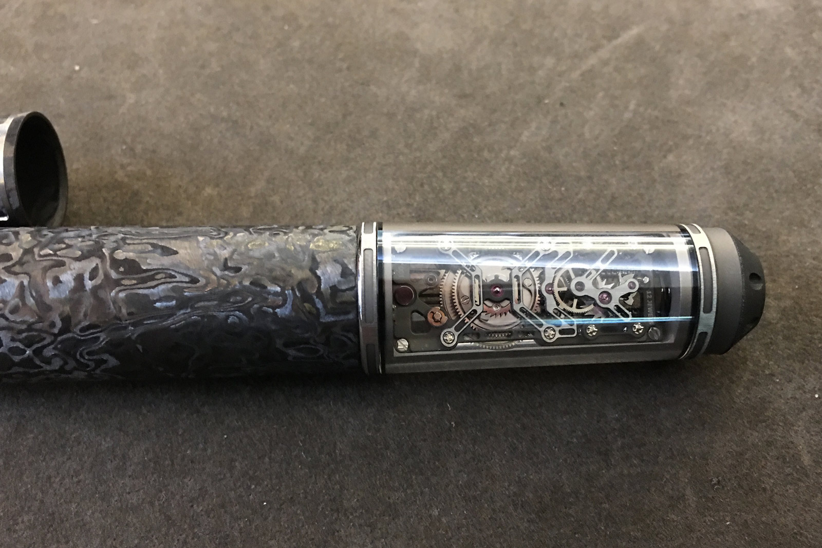 There are plenty of luxury fountain pens on the market though none as mechanically considered as this one. The materials used match those of any high-end watch—the white gold nib, grade five titanium for the movement’s bridges, rhodium plating covering the gears. A machined NTPT Carbon material makes up the pen’s body and because of the process in producing this specific carbon aesthetic, no two pens will ever be the same. Layer upon layer of carbon fiber has been heated, modified and then shaped. Finally, all surfaces are either microblasted or satin-brushed. From its four years in development to its limited production run (it’s not a limited edition, but the number produced will be restricted by the complexity of its creation) and the weight it carries in hand, there’s something both ridiculous and wonderful about a mechanically-powered pen that’s unlike any other.