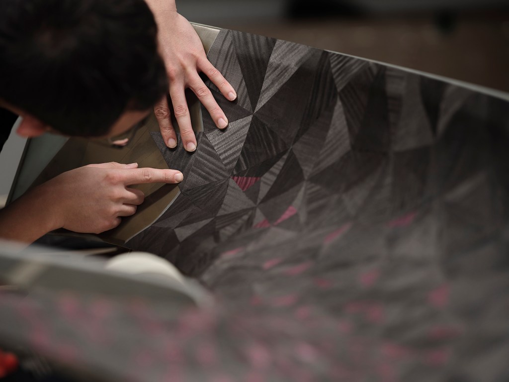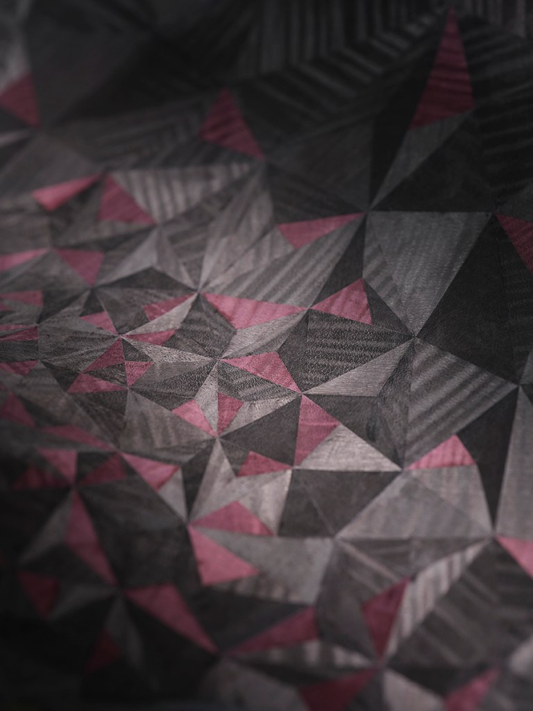 The clients requested that the car celebrates their affinity for France, where they have multiple properties including “a sizable concern in Champagne.” The aforementioned Baccara rose features an iridescence and lack of uniformity to its color that become core to the car’s personality, from its unique paint that took more than a hundred attempts to perfect to the surfaces’ texture, composition and way they look in different light. Its leather features that iridescence, with the parquetry an abstraction of rose petals and its multi-dimensional paint shifts between deep red and near black. “The client’s wish was to create the impression that rose petals have been thrown over the interior and exterior surfaces” in a very abstract way. This resulted in “the most complex parquetry in the history of Rolls-Royce,” shares Sina Eggl, the lead color and trim designer. “We put together some new techniques and understandings on how we could veneer across such complex geometry. The triangles have to be hand-sculpted and hand-shaped to match the geometry and fit perfectly within the pattern” when applied across the interior arches adds Finlay McCulloch, the wood shop’s project manager. He noted that it took around two years of planning to develop the parquetry.