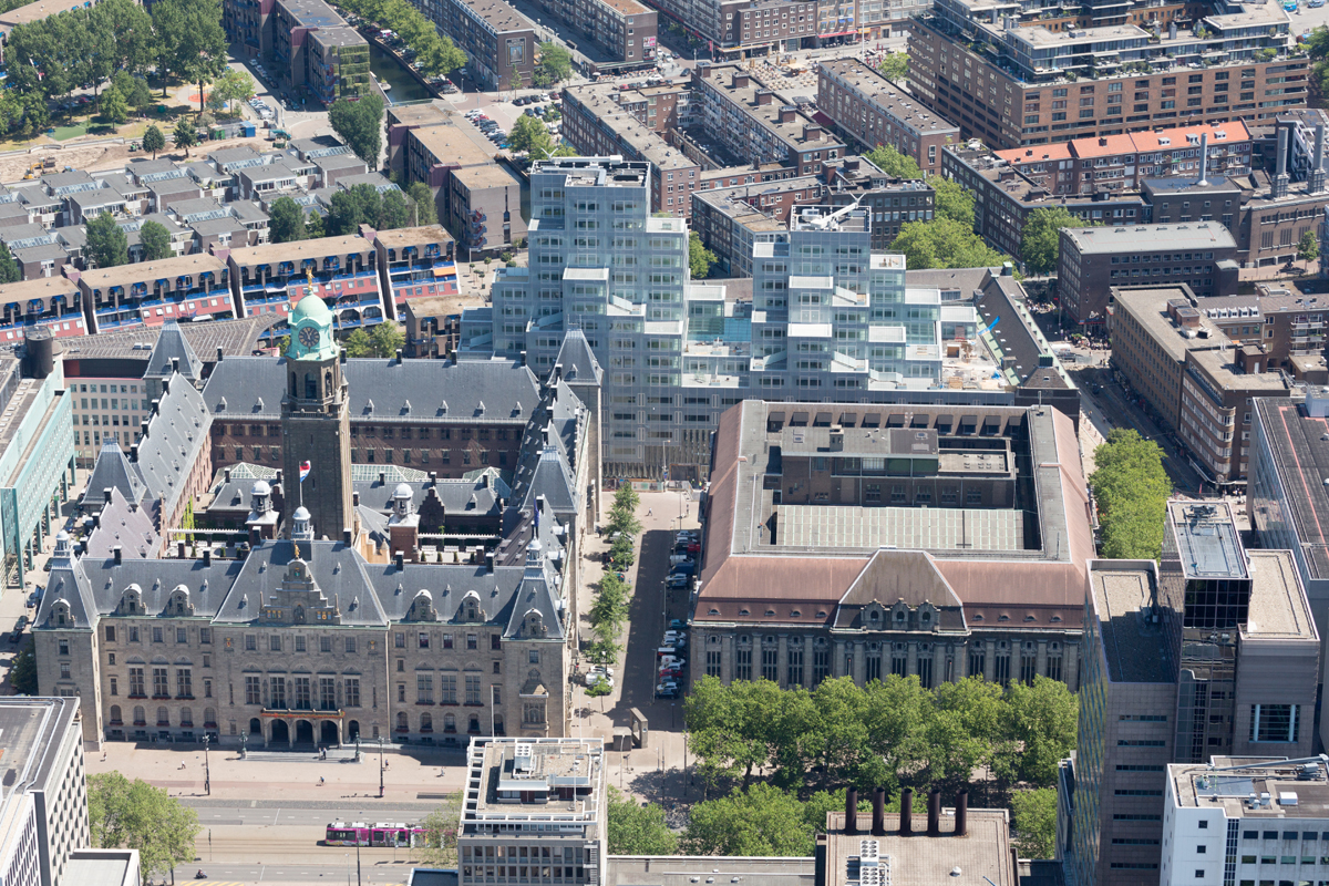 The latest addition to the city is the iconic Timmerhuis, which has been re-imagined by OMA, Dutch architect Rem Koolhaas’ firm, and designed by de Graaf. The building was originally built in 1950 to replace one destroyed in bombings, and part of the old design has been incorporated into OMA’s striking new creation, which was envisioned as a floating cloud of steel and glass. “Timmerhuis was designed five-six years ago as part of a competition,” de Graaf says. “The original brick building plays an important part in its design, which is reminiscent of a stack of shipping containers—a nod to Rotterdam’s history as a major port city. We wanted the building to combine urban living with the feel of a garden.” This has been accomplished by designing the blocks so that the roofs of some blocks create gardens, and terraces for others—in effect giving the building multiple rooftop spaces.