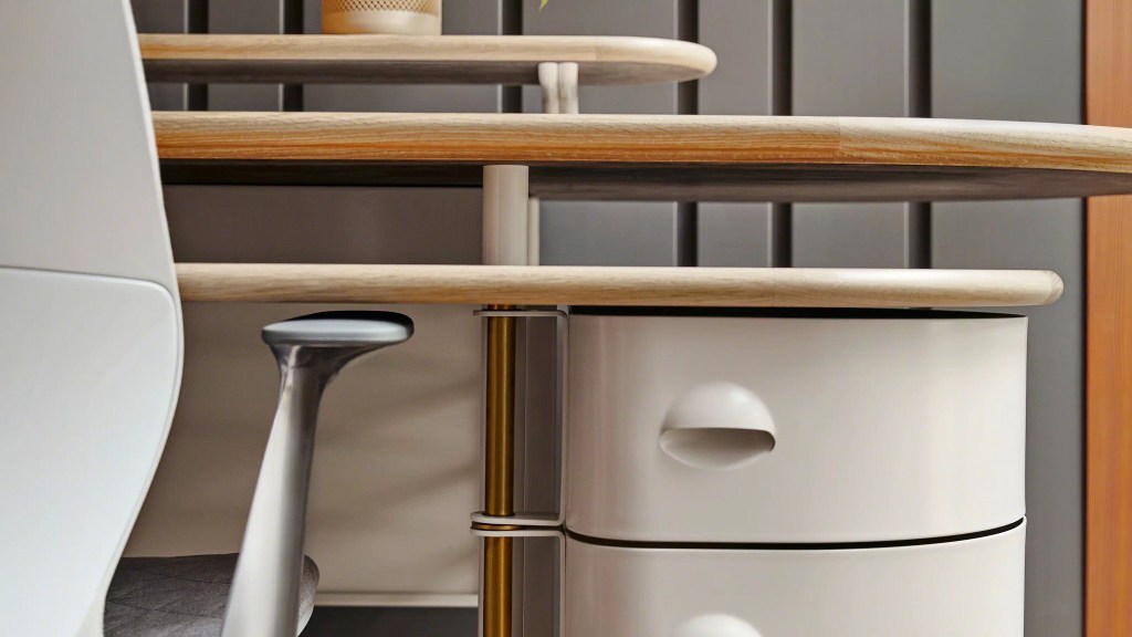 Meghan Dean, the General Manager for Partnerships at Steelcase, nods to their historic relationship with the architect. “Frank Lloyd Wright is part of our cultural heritage,” she tells us. “In 1938, for installation in 1939, the Johnson family came to Steelcase—which at the time was called the Metal Office Furniture Company—to manufacture the Wright-designed office furniture for their SC Johnson administration building in Racine, Wisconsin.” It’s this collection that informs the new line, and Steelcase keeps an original desk in their Grand Rapids, Michigan archive, which we were able to observe alongside the new pieces at their Columbus Circle office in NYC. The Art Institute of Chicago has one of the original desks, as does MoMA and several other museums.