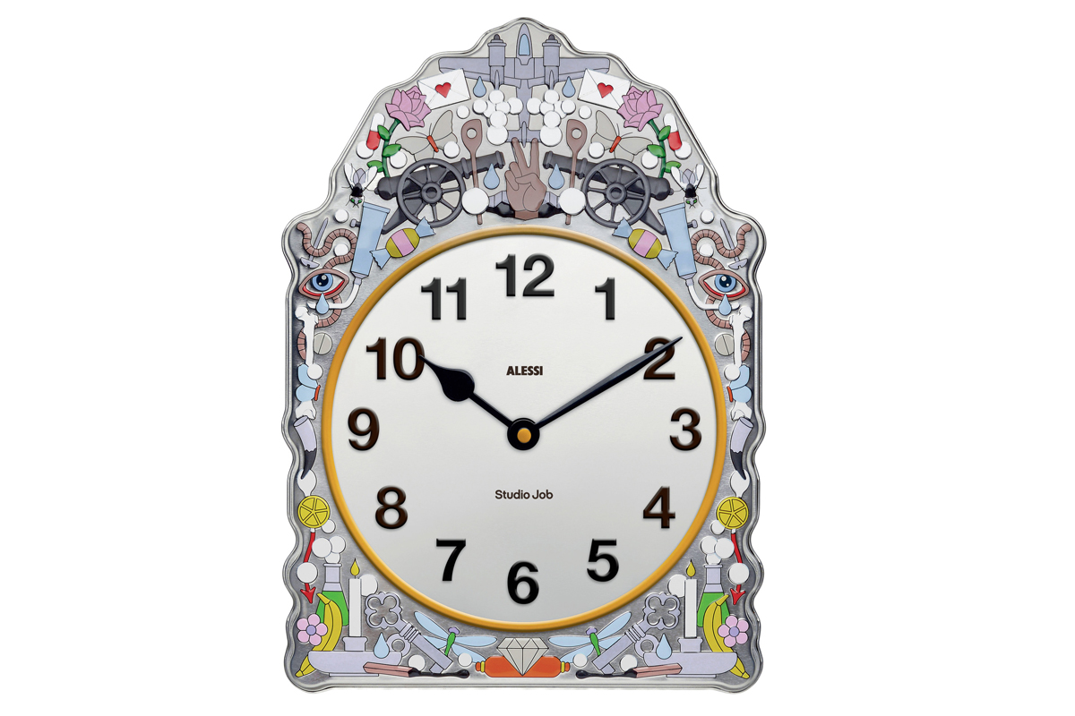 Best known for their unique creative approach that merges art and design, Studio Job‘s creations are oftentimes easily recognized. The two Flemish designers leading the studio (Job Smets and Nynke Tynagel) have a knack for using plenty of symbols—from the esoteric to the digital, and the classic to the obscure. During Milan Design Week we spoke with Smets about the industry as a whole, and the studio’s latest creation: the Comtoise Clock, designed for iconic Italian design house Alessi.