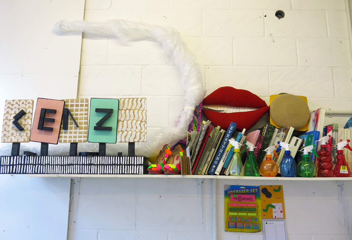 My favorite material to work with changes all the time. At the minute I’m obsessed with flocked metal. I just really like trying out new things, techniques and combinations of stuff. Like a soft-and-hard kind of thing, or a lacquered surface. I’ve been really obsessed with neon for a while now and made lots of neon stuff, but at the minute I’m mostly into textures. Like carpet—I’ve got rolls and rolls of carpet.