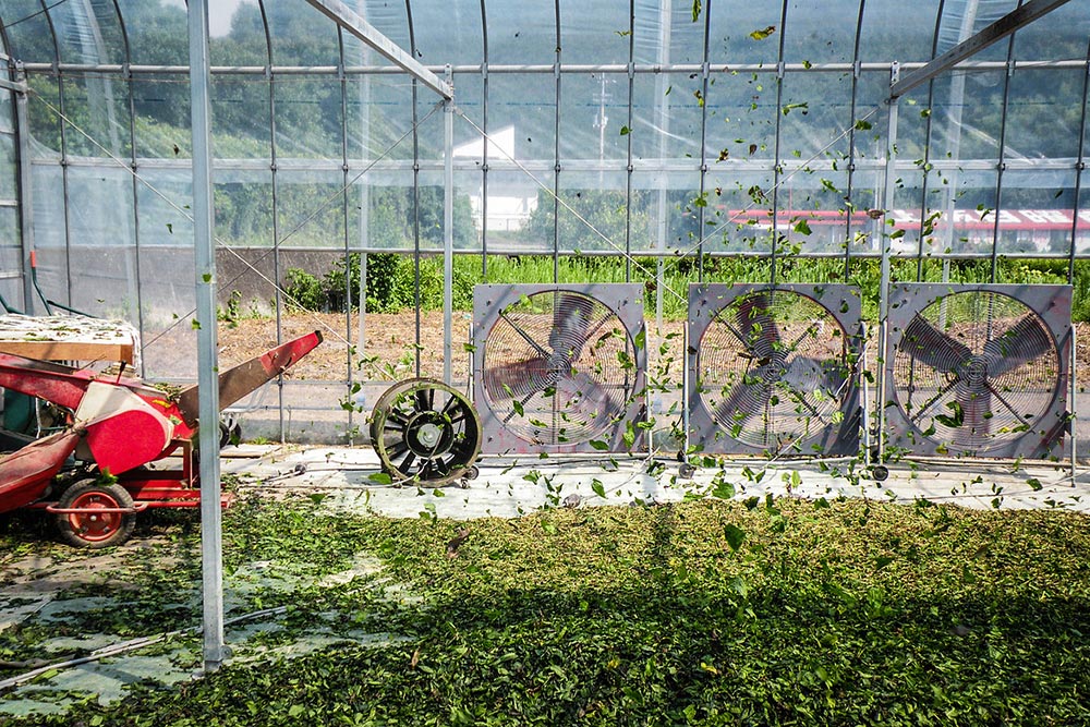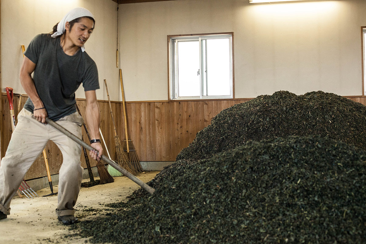 Watanabe notes how few sukumo masters are left in Japan. After cheaper synthetic indigo was developed and became more popular, what used to total in the thousands has dwindled down to a number countable on both hands. One difference between Nii and BUAISOU, he points out, is that their teacher only farms and makes the composted sukumo, which he sells to dyers. BUAISOU, wanting to keep everything in-house from start to finish, aspires to master two separate crafts: sukumo-making and indigo-dyeing.