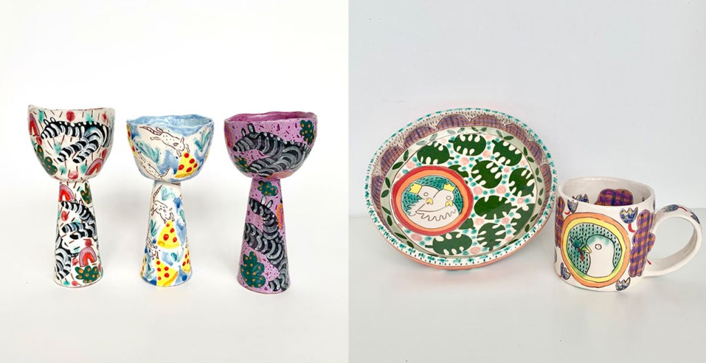 “I just want to be funny,” she says, standing next to a shelf stocked with her vibrant, absurdist cups. “There has to be humor, which I think is joy. And these are things that are meant to be used every day, so why not make drinking coffee a little bit more exciting?” Rendering nature fantastically, Im’s patterned ceramics elate both the quotidian and the imagination.