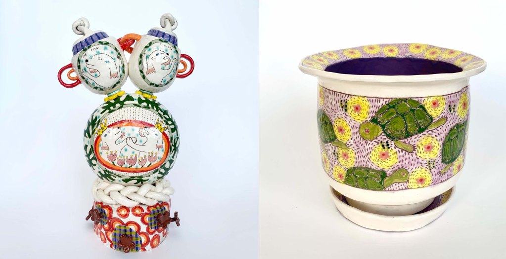 “Maiolica is a product of different types of ceramic techniques and traditions moving across the Middle East to Spain and then eventually becoming what we’re most familiar with in the Italian Renaissance,” she explains. Working with this tradition led her to enamor with terracotta. “Terracotta nowadays is used to introduce [pottery] to kindergarteners. When you start pottery, there’s this idea that you work toward high-value porcelain. I want to work with material that’s looked upon as low-class, something that children work with and then elevate that to something that doesn’t look like terracotta,” says Im. Not only does this present a fun challenge for her, but it also aligns with the type of art she wants to make, which she describes as “just stuff that’s approachable.”