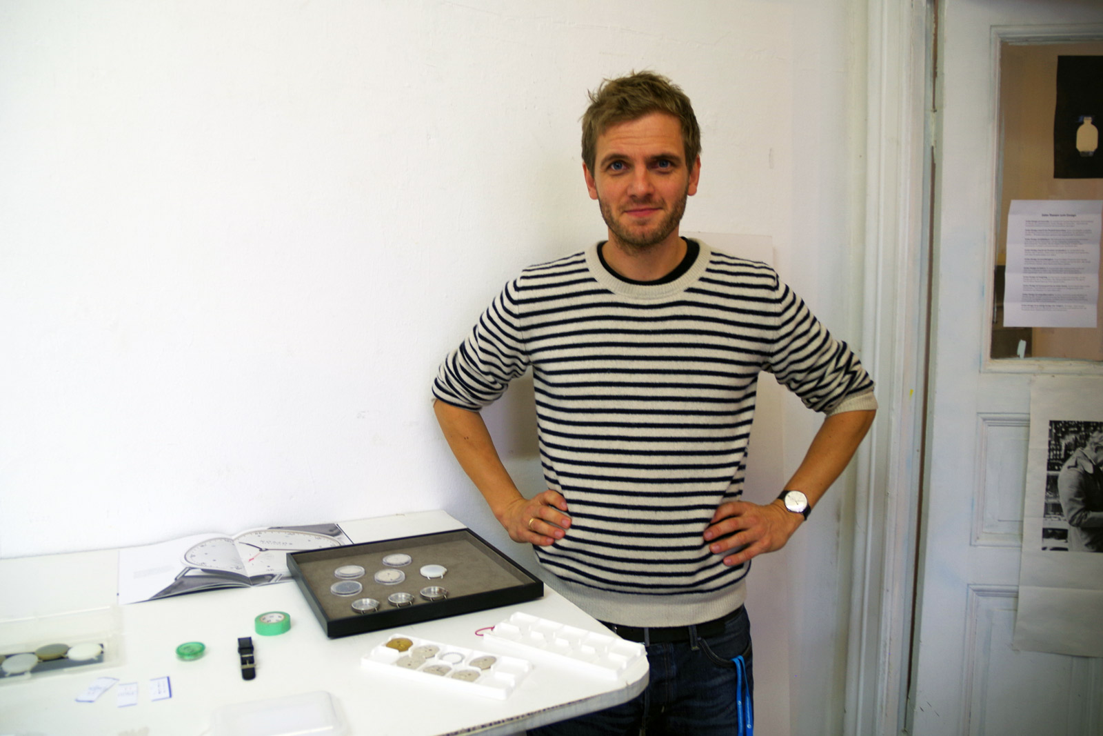 “Let’s say that I’m very close to messy,” industrial designer Mark Braun says as we enter his Treptow, Berlin studio. “But it helps with my work.” While the three-room space contains fascinating items aplenty (be that tools, inspirational knickknacks, books or an array of items he imagined and constructed across many types of media) messy isn’t the exact word. It’s very much populated—with design. Here, the highly awarded Braun works alongside two studio assistants and their balance of the digital and tactile makes itself known. Renderings occupy the computer. Sketches either lay on tables or are taped to walls. A 3D printer sits in his downstairs showroom space, but in the actual workshop a ceramics table occupies much of a corner, wood rests upon a wall and every constructive implement imaginable has a place. Impressively, Braun uses what he makes: from the desk in his office to the Nomos Glashütte Metro wristwatch on his person. And for the last 14 years, it’s all came to life here.