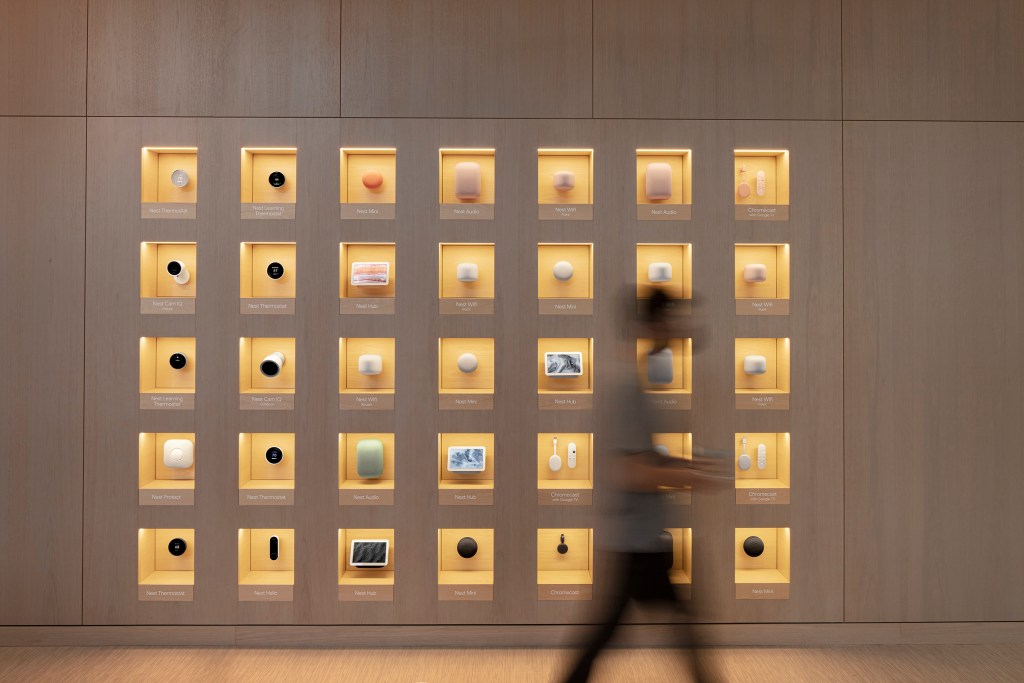 “Together, we had a brainstorm to note the feelings that the Google teams wanted to evoke in the store. One of them was wonder, another was inspiration,” Reddy tells us. “It was this warm and welcoming idea, but it was also to showcase these products in this really intimate way.” To do so, they knew they needed to work with the long footprint of the store and figure out how to animate its individual areas.