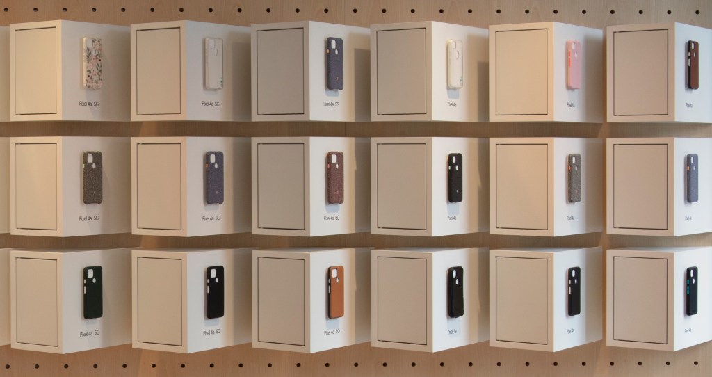 “I hate the way that pegs start out organized, but then by the end of the day consumers have picked through them, and it’s always a mess,” Ross continues. “and so Suchi built this really nice way to have the Pixel cases on the outside of a little box, [where] consumers can see and touch and feel them, but when they want to buy, they touch this door that pops open so that they can take one of the packaged cases out,” Ross says.