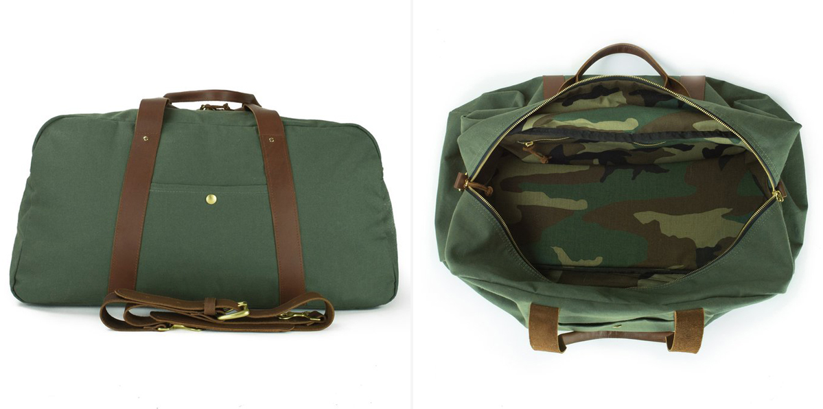 Today, Veterans Day, the brand has released several new products. We’re most excited about their heavy-duty Duffle, which is stylish and functional. Betsy tells us, “We wanted to design a product that was both well-styled and spacious, yet maintained a competitive price point.” The price point, however, didn’t hold the design back. With full-grain leather handles (which are made at SB Foot Tannery; owned by Red Wing Shoes and supplier to the US Army), no detail has been ignored. “One of the design processes we went through included substituting costly leather and brass hardware components with high-quality repurposed fabric-based materials,” Betsy says. But the brand’s “rigorous customer feedback process revealed the desire for a leather shoulder strap, so we designed a strap from American-sourced leather and plan to offer this accessory as an optional add-on feature.” The Camo Duffle’s interior lining is made from surplus 500 denier nylon fabric, which is ultra-durable. The Olive Duffle is made from a nylon/cotton twill, which is a surplus fabric used in older uniforms.