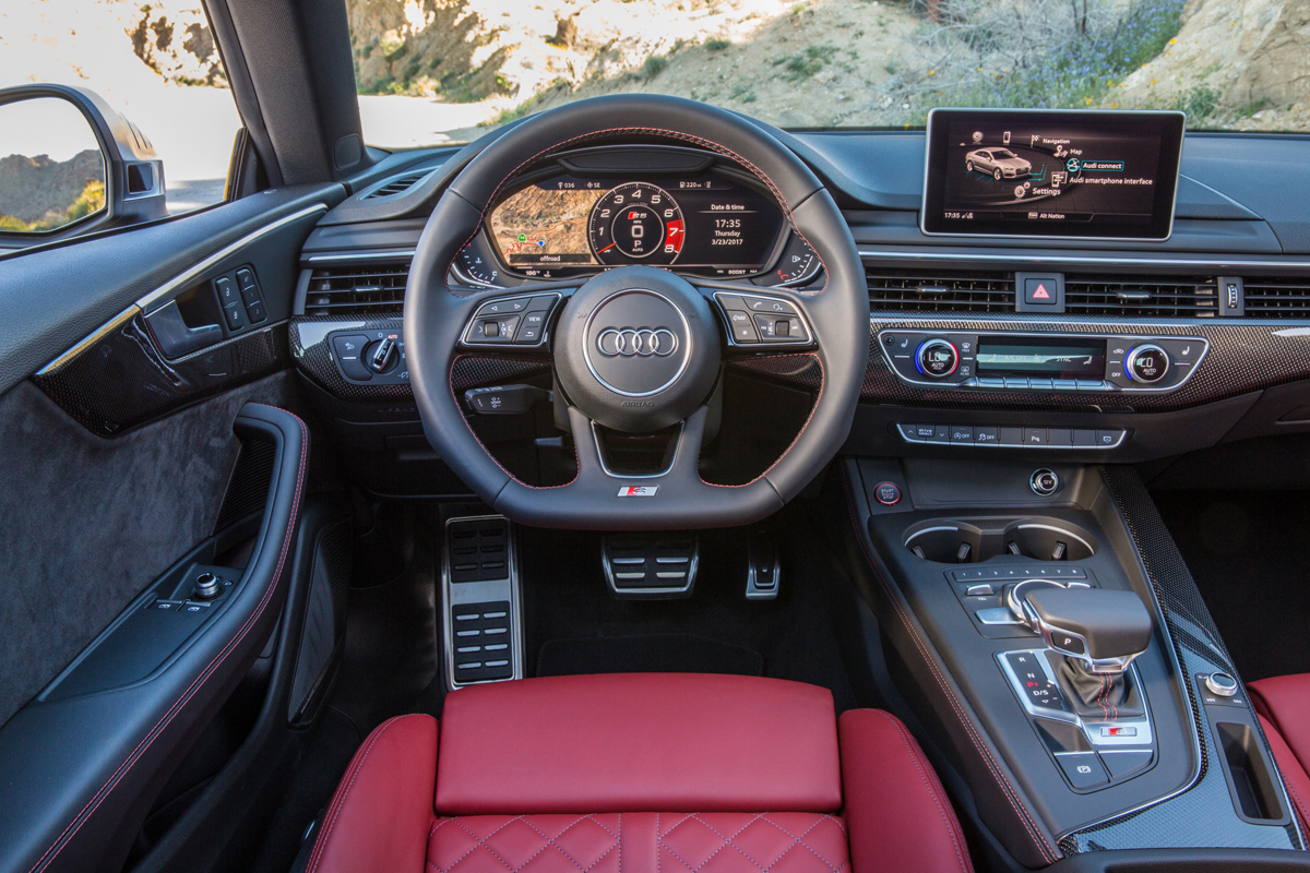 On the outside, there’s sleek sheetmetal that has been redesigned with a few new dramatic shapes, creases and crisp wraparound lines that emphasize the vehicles’ length, while muscular wheel arches accentuate the sports-minded appeal of standard 18-inch (optional 19-inch) wheels. Up front, the S4 wears full LED headlights with LED daytime running lights, and a wider and flatter version of Audi’s single-frame grille with aluminum-optic double-blade bars. LED taillights, S-model-specific quad exhaust outlets, and a rear trunk lid spoiler punctuate the back. Notably, the S5 is both wider and lower with a number of updated elements; a more prominent power bulge on the hood is meant to emphasize its athletic prowess. Red brake calipers are available with the sport package and enhance its alluring style.