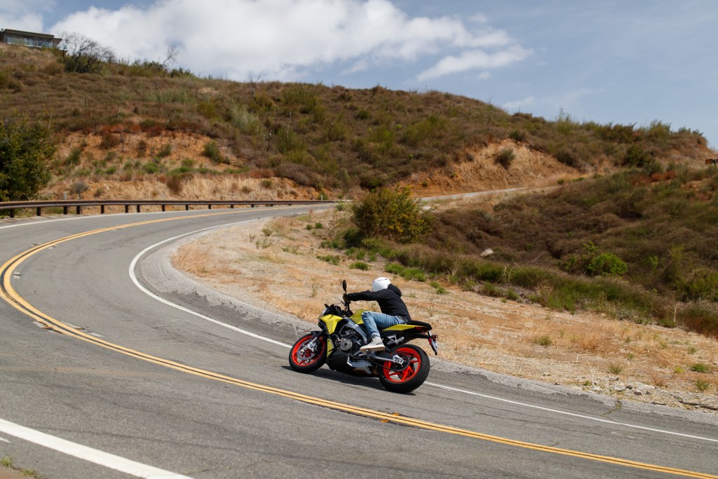 Overall the Tuono 660 is an exercise in restraint and the result is a highly enjoyable experience that’s accommodating and exhilarating. At 403 pounds, the bike is easily flicked side to side and the chassis works in perfect harmony with the suspension to instill confidence in the rider. The 660 soaks up the bumps, ripples and sudden undulations that define the canyon roads east of Malibu with ease, allowing us to hold our chosen line without so much as a twitch of the eye.