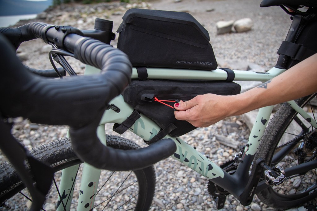 Equipped with three water bottle mounts on the triangle and two handy “anything” mounts on the forks, the carbon frame means the rider needn’t rely solely on velcro-fitted accessories. (Speaking of velcro-fitted accessories, bikepacking bag brand Apidura collaborated with Canyon to create sleek, lightweight and waterproof bags that fit perfectly on the frame.)