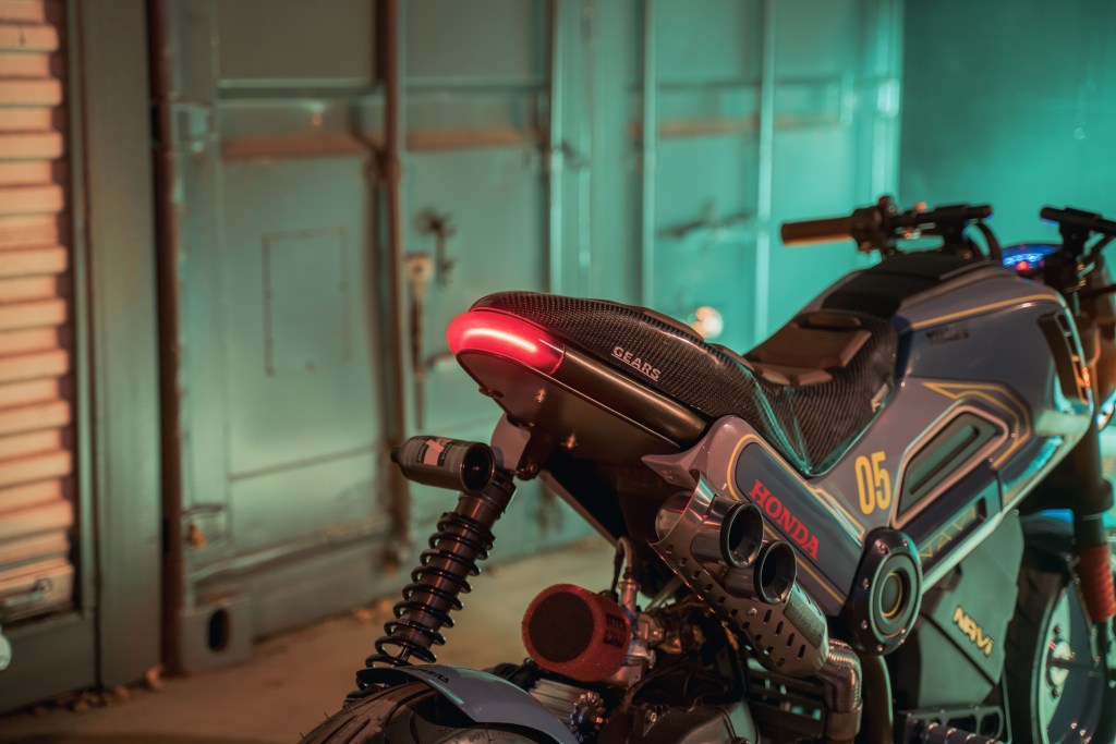 Rather than preserve the brand’s DNA (as MNNTHBX did using traditional red-and-blue Honda racing livery), Steady Garage went for a retro-futuristic, cyberpunk-leaning customization. Technical director at Steady, Kevin Dunn, cites films like Ready Player One as influences on the shop’s style, and also says there’s a clever trick with their Navi build: using solid wheels, as “it just looks a little more futuristic and stretches it visually.”