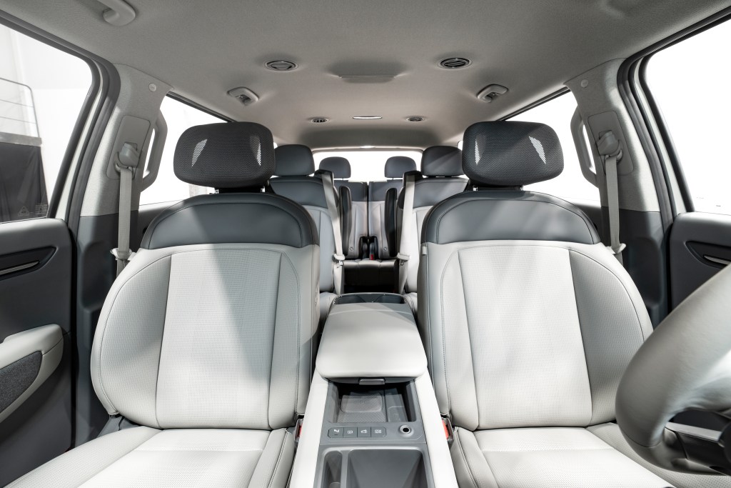 Inside, the EV9 emphasizes comfort and tranquility, defining a space that aims to be more than something that gets you from one place to another. As such, the interior becomes a hub for lounging. Flat-floor architecture and a long wheelbase create a generous space for occupants to connect and kick back with lounge-style comfort in all three rows (the vehicle is built on Kia’s Electric Global Modular Platform, E-GMP). This is further emphasized with the design’s nod to negative space. As Habib says, “You’ll see on the dashboard, on the doors on the console, we’re not just working with the object itself, but we tried to work with the space between the objects. We actually tried to create negative space to amplify that feeling of space.” And it works, very well.