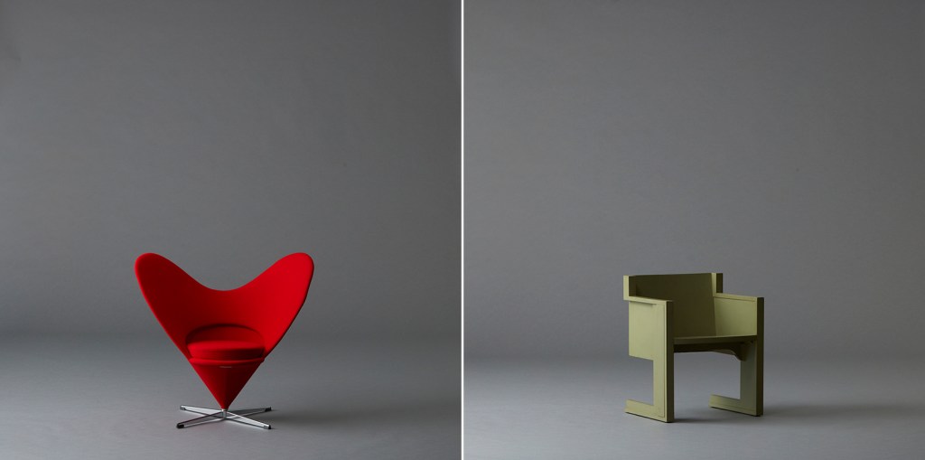 Looking through the light-filled space also reveals how designers beautifully utilized color—from Verner Panton’s vibrant red Heart Cone Chair (1959) to Gerrit Rietveld’s painted Red Blue Chair (1923) and Rudolph Schindler’s moss green Cantilevered Armchair (circa 1926-1940).