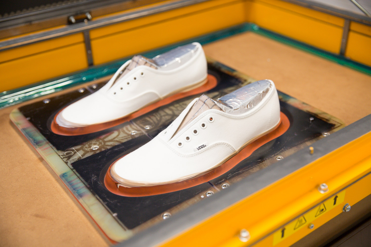 The most groundbreaking process, however, is known as Project Anaheim. This directive will hopefully one day enable consumers to take any pattern they want, or any picture whatsoever (so long as neither are the property of another) and apply it to an entire shoe—in 15 minutes or less. Right now, we witnessed it in action. A snapshot was taken of Van Doren’s shirt, uploaded, laid out on top of Vans, and then printed on film.
