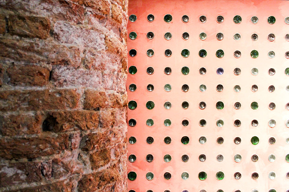 An equally strong and peculiar approach by Madrid-based José María Sánchez García appears in the form of a wall punctuated by glass bottles, a smart way to save material and use leftovers.