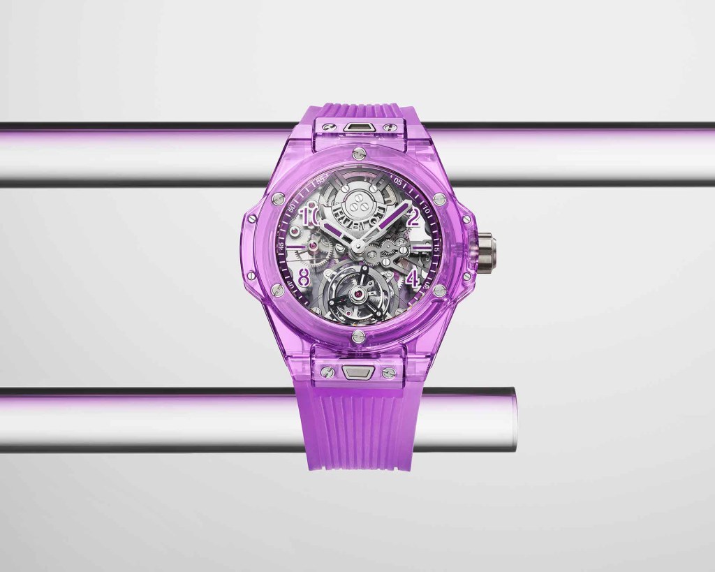 Housed within a playful purple sapphire crystal case (a technical feat unto itself), the skeletonized movement of Hublot‘s Big Bang Tourbillon Automatic Purple Sapphire incorporates a tourbillon, micro-rotor and three sapphire bridges. This skeletonized power source, dubbed the HUB6035 Manufacture Automatic Tourbillon Movement, is a new in-house invention and it’s a wonder to observe in motion. As for that vibrant purple hue for the case, Hublot tapped expert chemists. The result is a covetable 44mm wristwatch limited to 50 pieces.